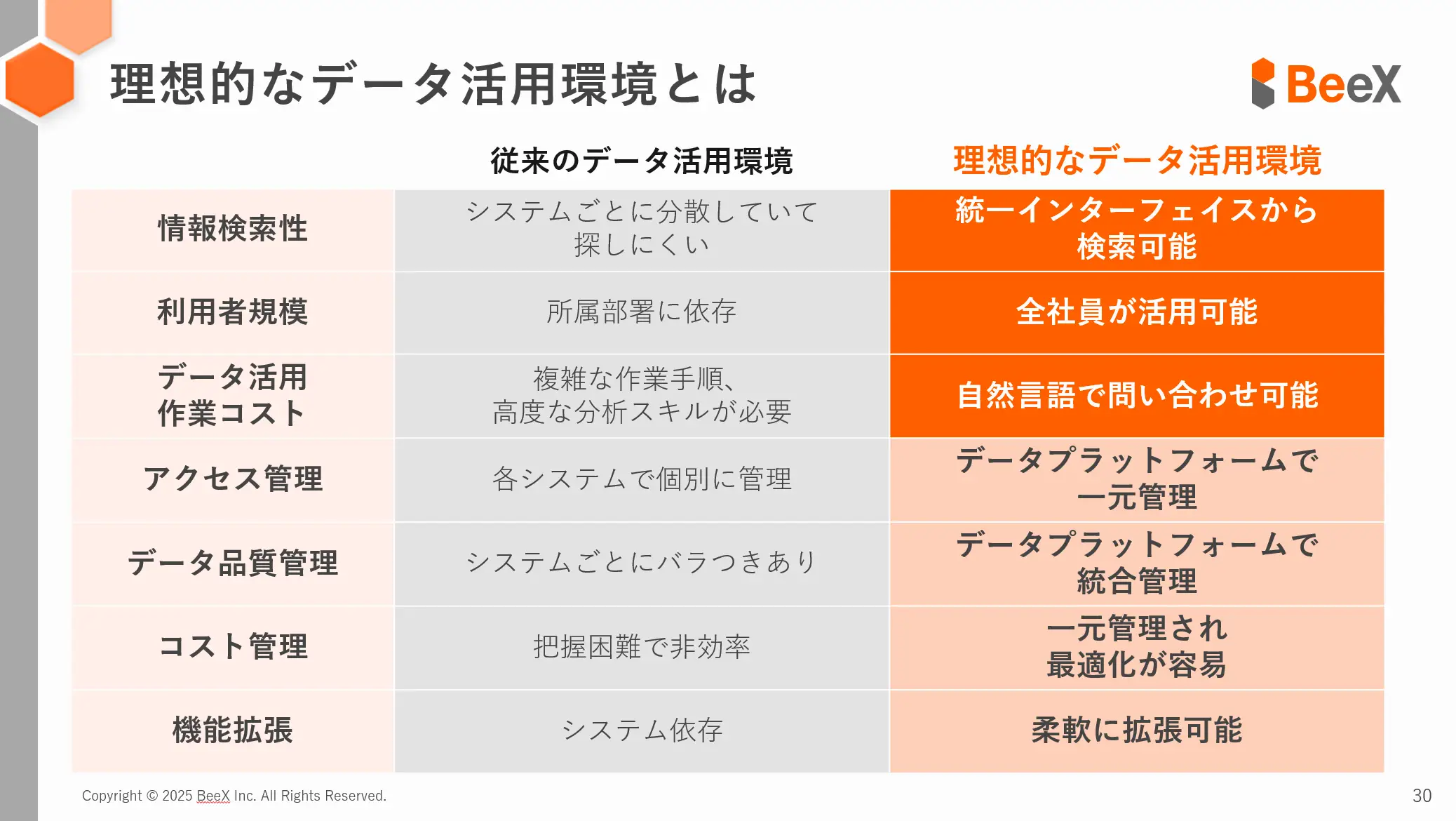 - 分析ユーザにとっては、幅広いユーザが様々なデータを検索でき、それについて自然言語で問合せ、分析可能であることが大きなメリット