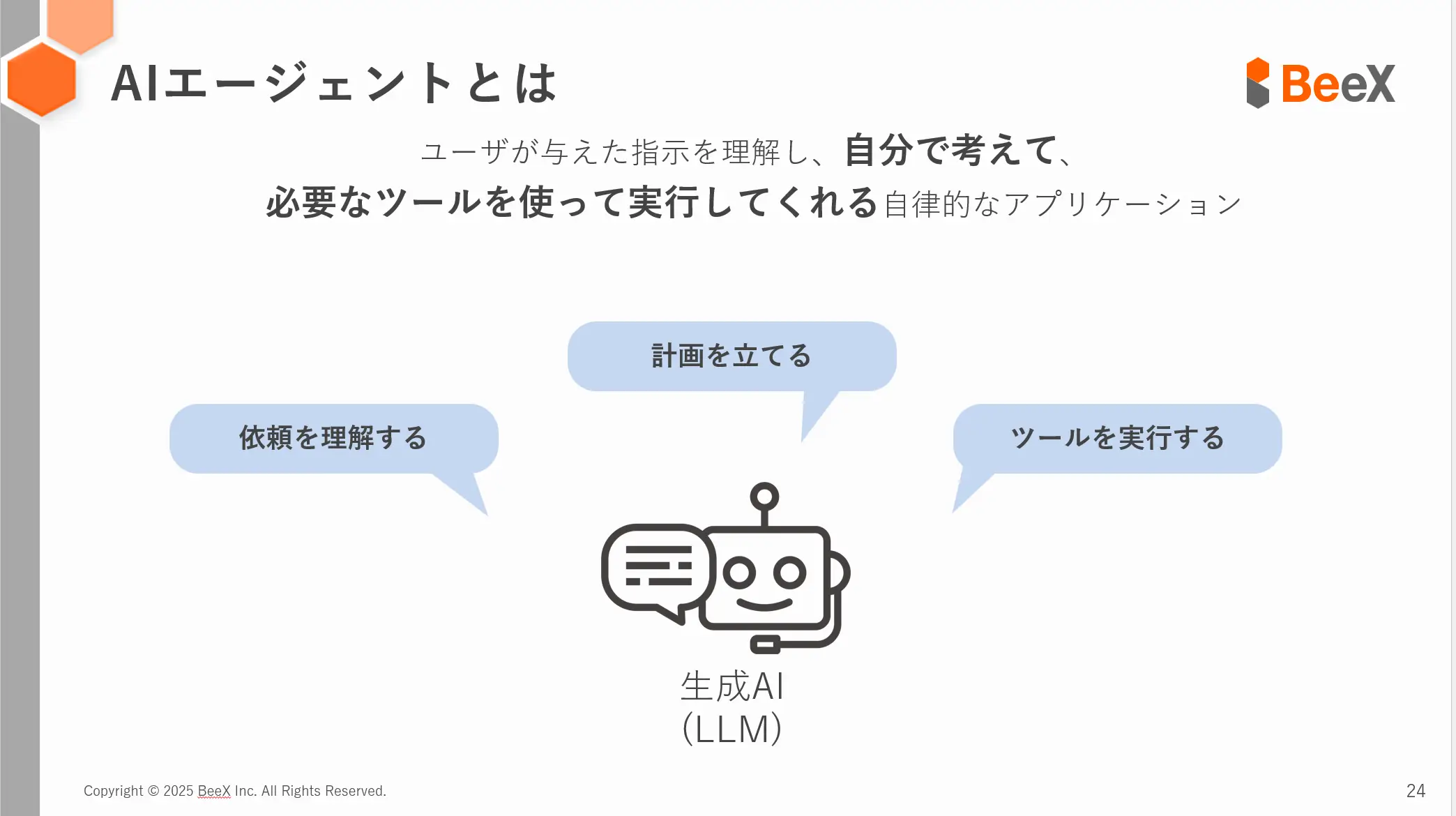 AIエージェントを簡潔に言い換えると「ユーザが与えた指示を理解し、自分で考えて、必要なツールを使って実行してくれる自律的なアプリケーション」と解釈しました。