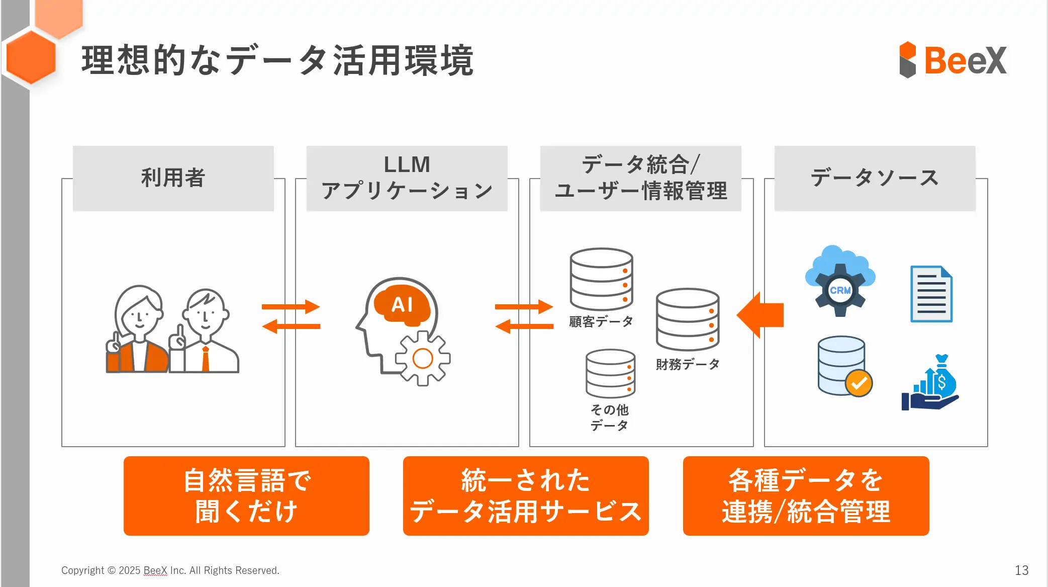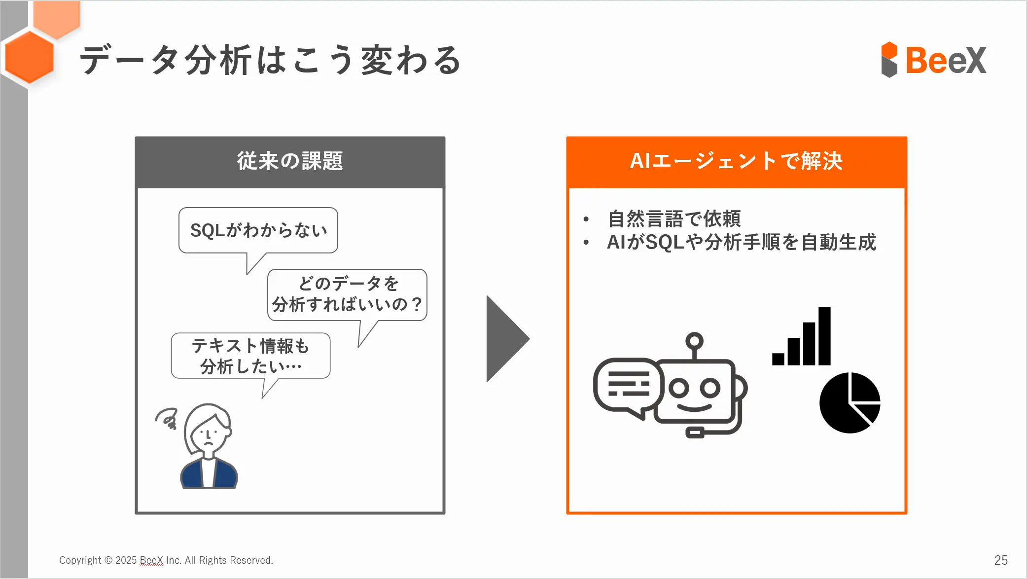 データ活用の課題であった、活用のためのデータ分析に関する知識不足やデータ自体の知識、また、高度な分析をするためのテキスト情報などを組み込んだ分析実行をAIエージェントを介して自然言語で行うことで、高度な分析を実行できると説明しました。