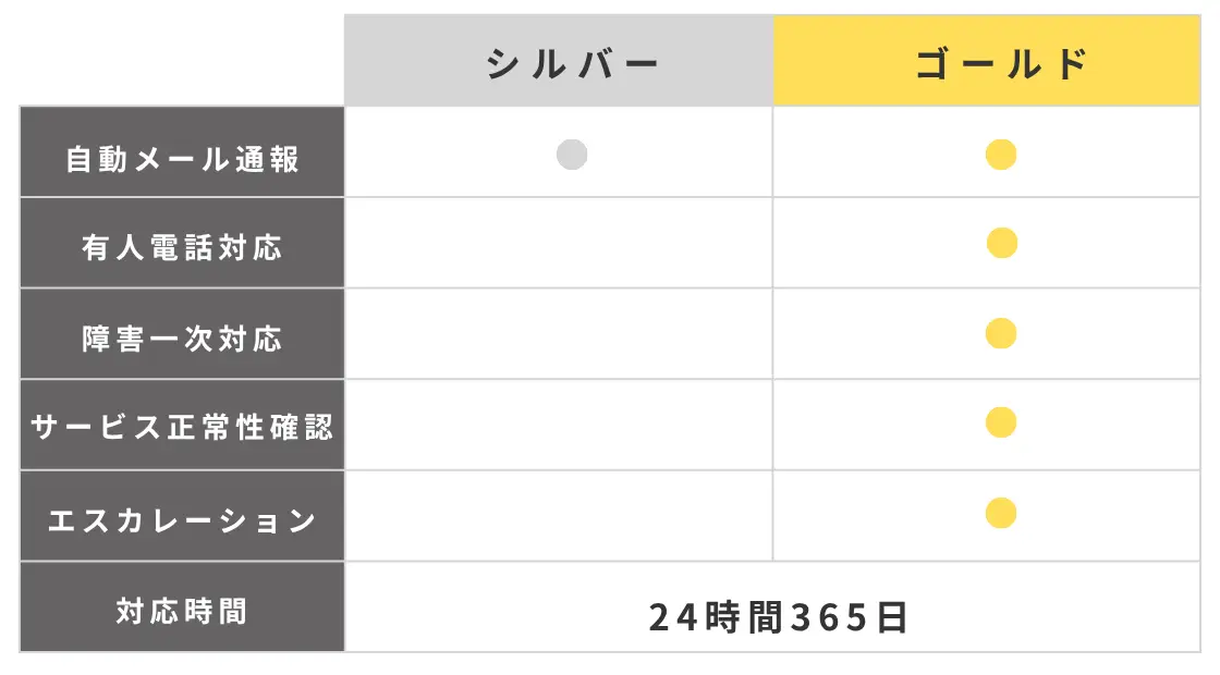 シルバープランの監視機能に加え、障害発生時の有人電話対応(日本語)および障害一次対応※を提供。本番環境や業務影響の大きいシステムに対して迅速な初動対応と運用支援を行い、安定稼働を継続的に支援します。